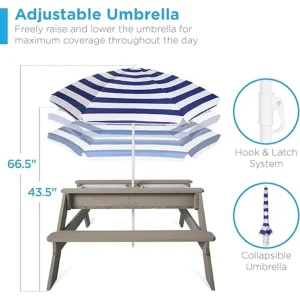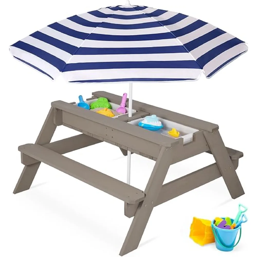 Splash, play, and learn! This versatile 3-in-1 Sand & Water Table transforms outdoor time into a hands-on adventure full of creativity and exploration. Designed for kids ages 2–6, it works as a sand & water table, a picnic table, and a play station all in one. Perfect for backyard fun, playdates, or early learning, it encourages sensory development, fine motor skills, and social interaction. The included umbrella provides shade on sunny days, keeping outdoor play safe and comfortable while little ones build, splash, and create.